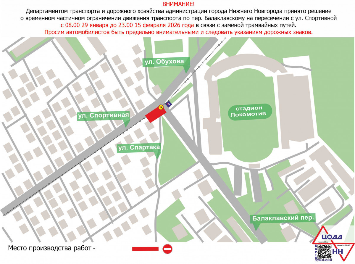 С 08:00 29 января до 23:00 15 февраля будет ограничено движение транспорта по переулку Балаклавскому на пересечении с улицей Спортивной. Это связано с заменой трамвайных путей, как сообщает пресс-служба администрации Нижнего Новгорода.